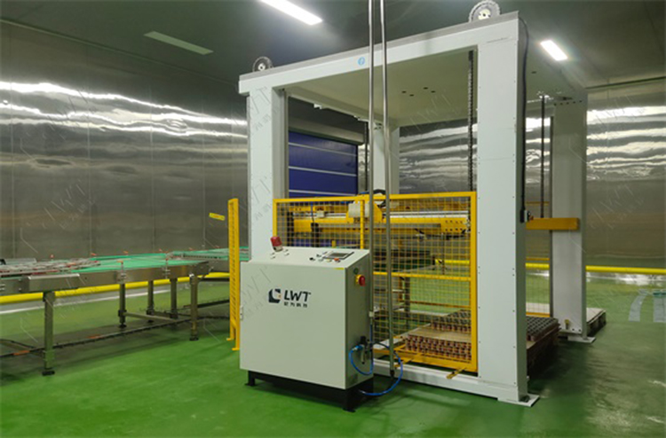 此過程中,由于沒有先進的設(shè)備,大部分廠家只能雇用大量的人工來完成實罐的碼垛、薄膜纏繞、卸跺作業(yè)。有的廠家甚至采取不可思議的辦法:先將罐頭人工裝入周轉(zhuǎn)紙箱,然后將紙箱堆疊到托盤上,送至保溫庫存放;然后人工卸下堆垛,取出罐頭,打檢噴碼,后再一次裝箱出庫。這不僅增加生產(chǎn)成本,也影響生產(chǎn)速度,罐型越小問題越突出。