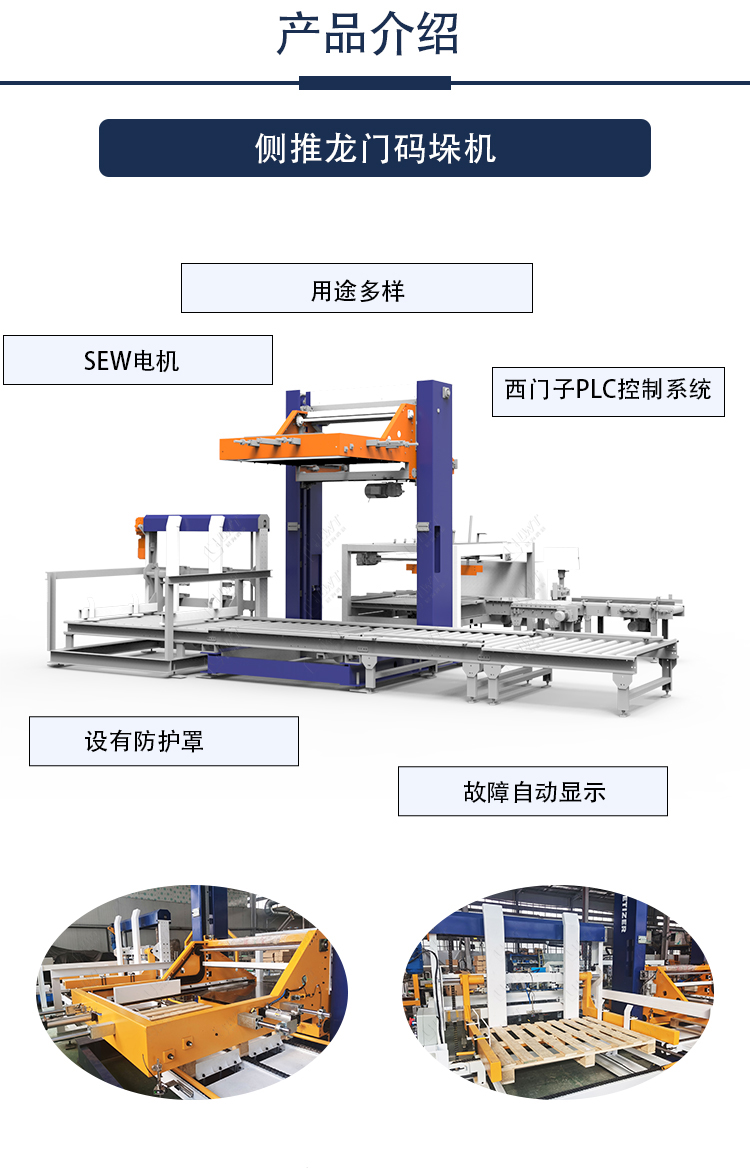 龍門側(cè)推碼垛機(jī)結(jié)構(gòu)骨架為焊接結(jié)合方式,底座可調(diào),主機(jī)升降臺(tái)采用SEW電機(jī)傳動(dòng),入口加速輸送帶將進(jìn)箱分離,堆棧區(qū)動(dòng)力滾筒輸送,2.5m長(zhǎng)棧板輸出,自由輥筒輸送帶,周圍安全防護(hù)裝置,采用德國(guó)西門子PLC控制系統(tǒng),可移動(dòng)式人機(jī)接口,故障自動(dòng)顯示。