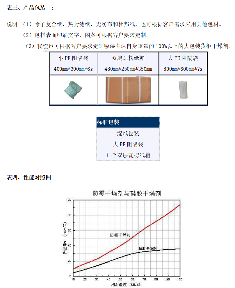 我們公司多生產(chǎn)的防霉干燥劑產(chǎn)品質量環(huán)保干燥劑通過SIMT國家測試中心及SGS的認證,產(chǎn)品質量達到美國標準MIL-D-3464E及德國標準DIN-55473.相關技術表如下: