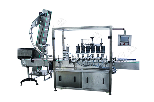 自動提升上蓋、旋蓋,瓶子直線進入,連續(xù)旋蓋,速度快,穩(wěn)定。