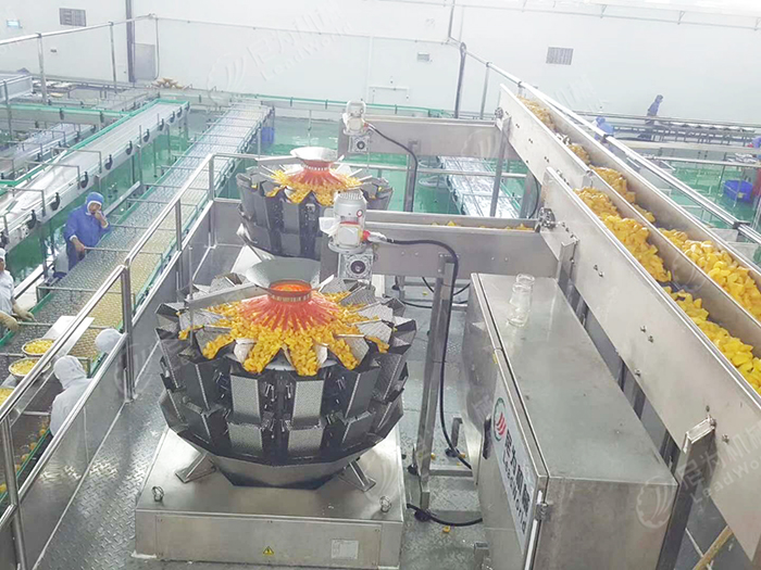 (2)按主機能力配置不同規(guī)模的連續(xù)化生產(chǎn)線。故蘿生產(chǎn)線視四道機(去皮、切端、通芯、括肉)的能力80個/min機分級規(guī)格進行配置。桃子生產(chǎn)線視桃瓣挖核機的能力70~80個/min及分級規(guī)格進行配置?;鹜壬a(chǎn)線能力750kg、1000kg、1500kg、2000kg進行配置。